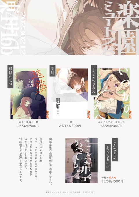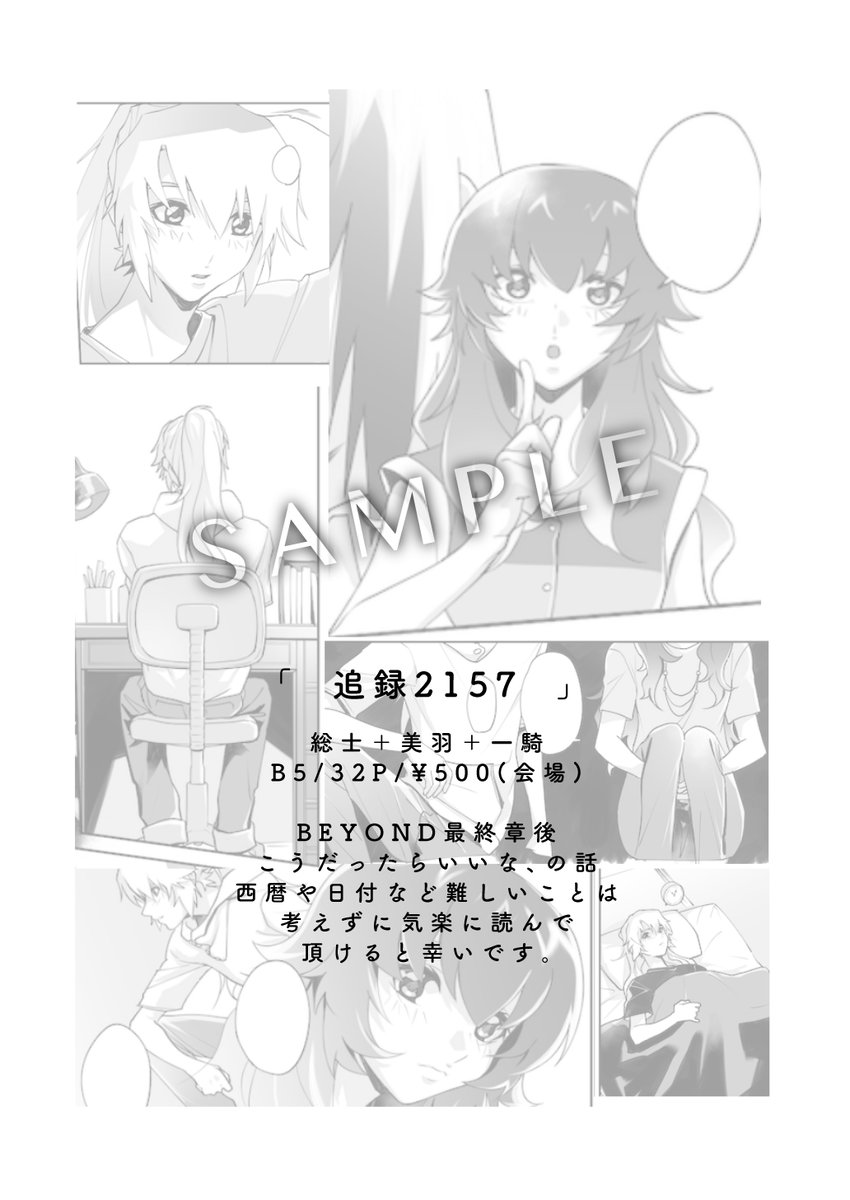 楽園ミュートス8新刊 「追録2157」 B5/32P/¥500(会場) 総士+美羽+一騎(CPなし) 詳細↓ pixiv.net/artworks/10457… BEYOND最終章後のこうだったらいいなの話。 遊びを入れてみたので、本を手にとって楽しんでもらえるようなものになってるはず。仕上がりが自分でも楽しみです。
