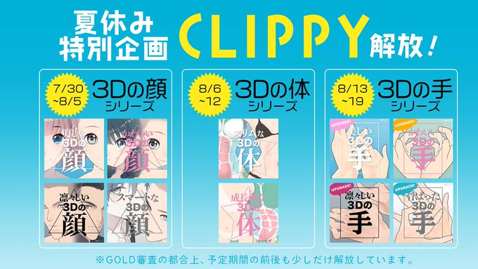 🏝️夏休み特別企画🏝️ 今年もやります、🆑ℹ️🅿️🅿️⤴解放❗️ ASSETSにて「3Dの顔」「3Dの体」「3Dの手」のCLIPPY販売をします! それぞれ解放期間がありますのでご注意ください。 assets.clip-studio.com/ja-jp/search?u…