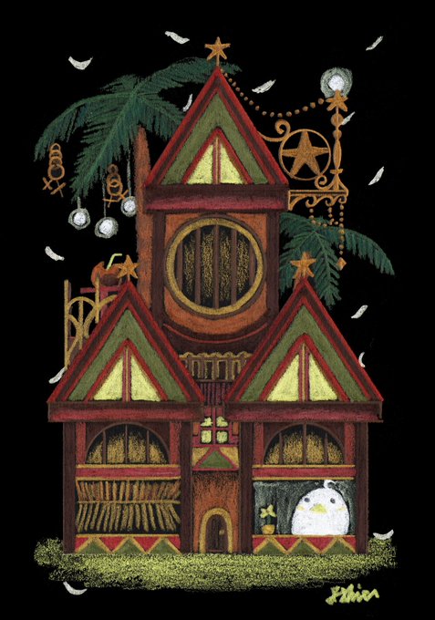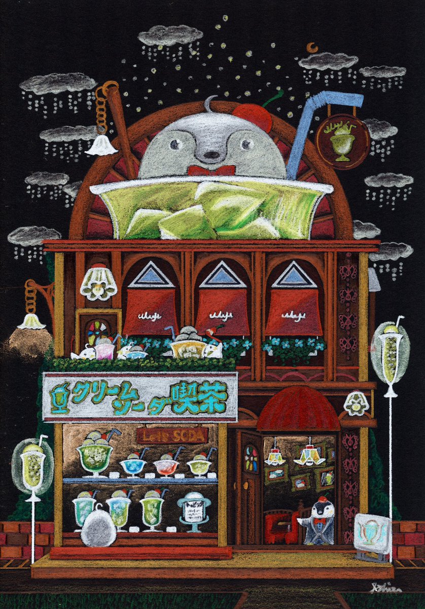 子ペンギンのクリームソーダ喫茶🍒 クリームソーダ専門の喫茶店。ヒエヒエで美味しい。お店からはいつも泡が出ていて雲ができている。あたりはなんだかシュワシュワしてるらしい。 #illustration #色鉛筆
