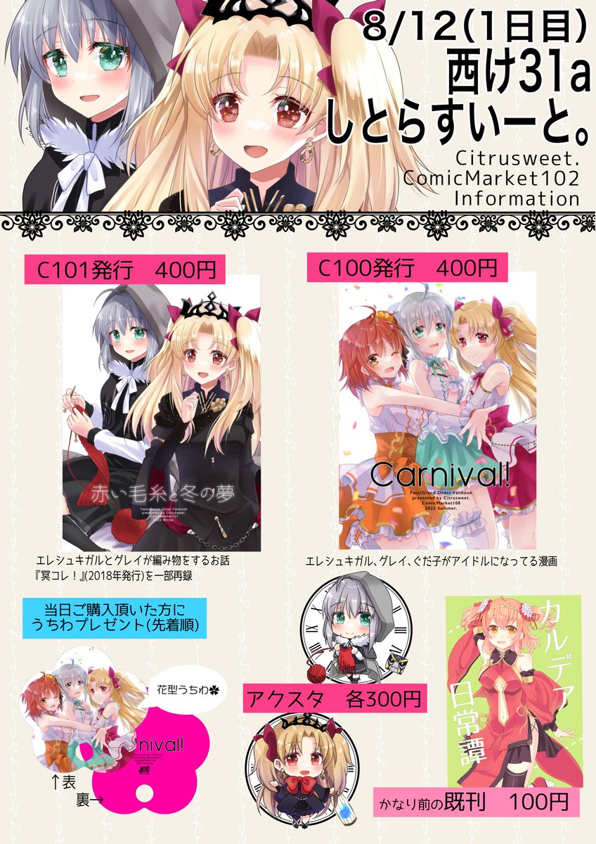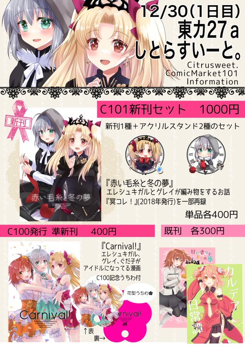 21 32 C101おしながきです。 30日(金) 東3ホールカ27a【しとらすいーと。】 エレシュキガル、グレイ、ぐだ子ちゃんあります。 よろしくお願いいたします! #C101 #お品書き #FGO 22/12/28 16:39