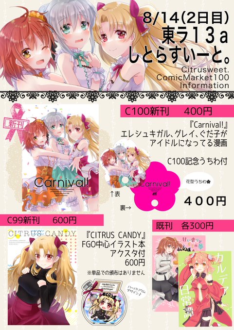 14 14 本日!東ラ13a「しとらすいーと。」にてお待ちしております😌当初J-Coin Pay対応予定でしたが現金のみとさせていただきます🙇♀️また、今回スケブはお受けできません。よろしくお願い致します! #FGO #C100 #C100お品書き 22/08/14 07:50