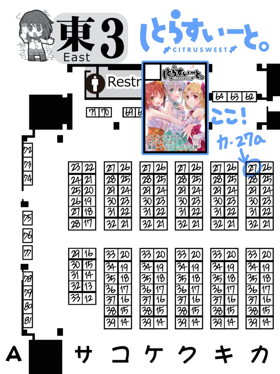 22 29 ◎あなたのサークル「しとらすいーと。」は 土曜日 西地区 “け” ブロック 31a に配置されています。 スペースいただけてました! イラスト+漫画のカラー本やグッズを考えてます😌 #C102 23/06/09 17:13