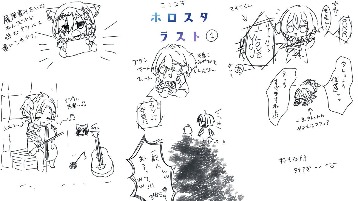 天真くんが人狼やってるのみれて新鮮で嬉しかった!1億を3億にしてる絵好き^v^♪ 画伯たちの絵吸えて栄養価高かった! 次はシエン君捕獲できるといいな~! 皆花咲の森に幽閉される展開、アツい M&H…いったい何者だったんだ…虚無仮面がcuteってことしか…わからないな…… #ホロスタお絵描き人狼