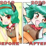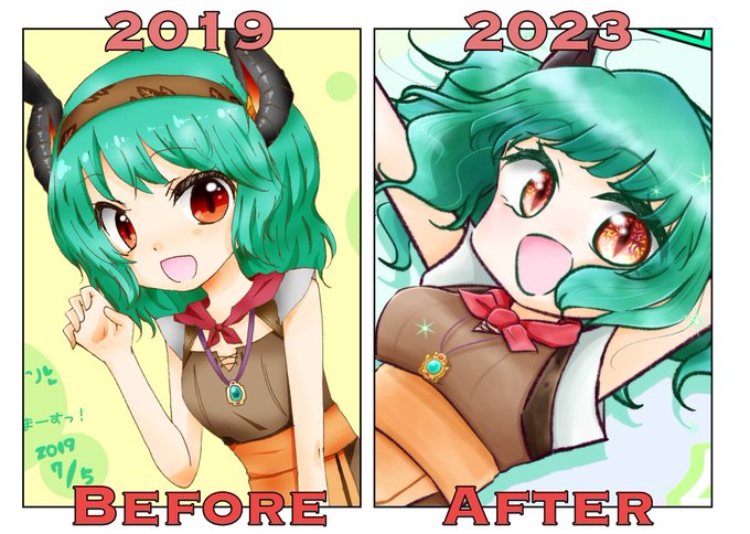 左 #最近フォローした方は知らない過去絵を晒す 右 #今月描いた絵を晒そう 初めてのFA(ファンアート)と今月のFA!上達速度は人それぞれだけど描き続ければ上手くなるんだなぁという実感…!🤗でへへ!笑