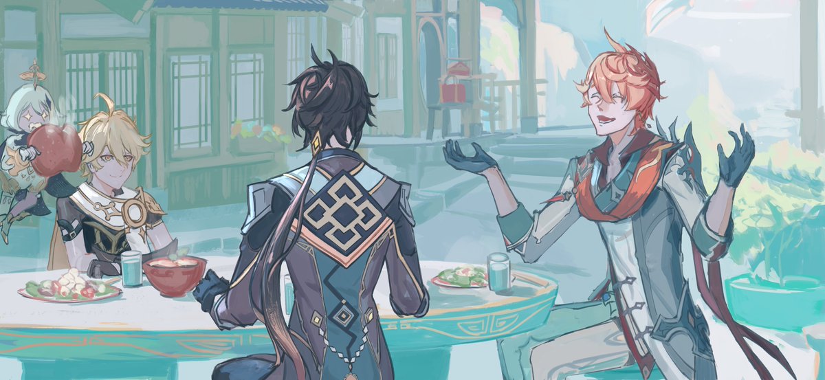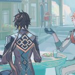 「旅人~!久しぶり!」 「来たか旅人。待っていたぞ、そこに座るといい。」 #鍾離イラストコンテスト #原神 #Genshinimpact #zhongli