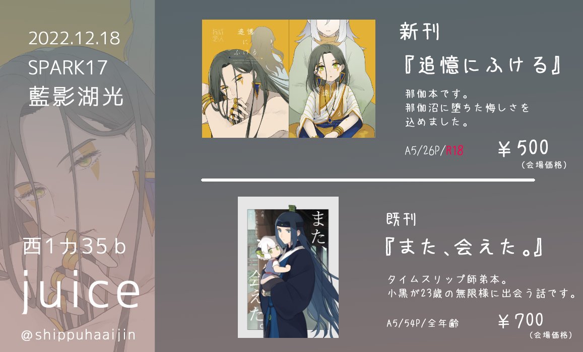 12/18 SPARK17内【藍影湖光】お品書き 西1 カ35b【juice】 新刊の那伽本、既刊の師弟本がある予定です。 新刊と既刊URL先にもまとめてます #pixiv pixiv.net/artworks/10367…