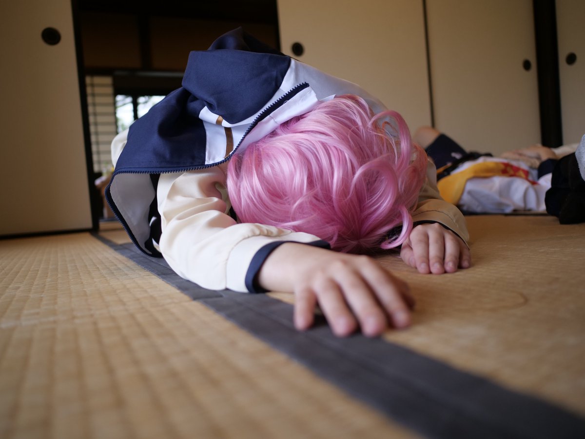 Cos/秋田 お昼寝の時間 この本丸の秋田はちょっと……いや、かなり寝相が変わっているようです……🤭 秋田がごめん寝してるところが見たくて撮っていただきました🙏 いち兄の上着もかけてもらって幸せ🥰 髪のふわふわ具合、見てほしい……! 📷→@gm_nakihaku #今日も愉快な粟田口併せ20221009