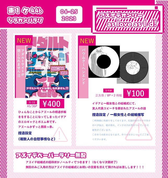 ●お品書き失礼します! 12/18 - Beckon of the Mirror 16 【西2 ホ14b】にてサークル参加いたします!よろしくお願いします〜!全部アズイデ本です! 🅿️pixiv.net/artworks/10367… ・品書きに画像載せられなかったのですが机上に「陰キャちゃんペーパーラリー」の無配ペーパーを置かせて頂きます!