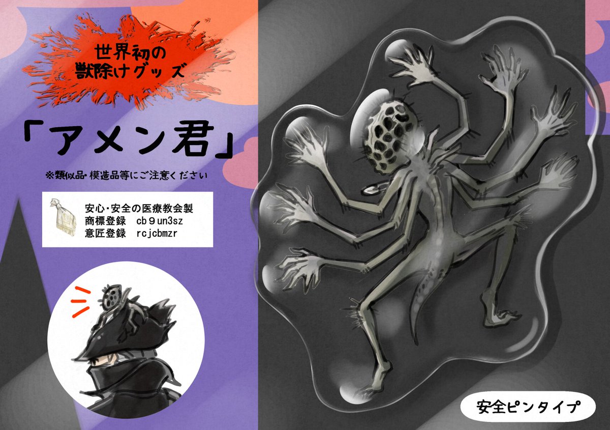 【医療教会 新商品のお知らせ】 獣除けをするならアメン君! 狩人A「これを付けると狩人達に大人気です」 聖歌隊A「啓蒙が常に上がっているような気がします」 ヤーナム市民「あああああああ!」 ?「おお…アメンドーズ…アメンドーズ…憐れなる落とし子に祝福を…」 この他にも悦びの声が続々と!