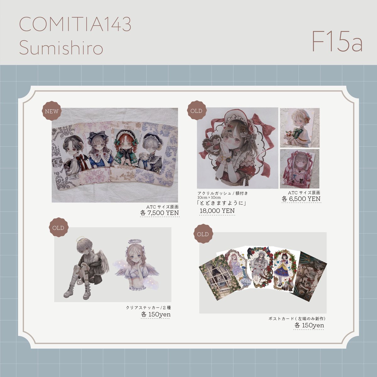 COMITIA143に【F15a】にて、スミタニ(@oxopz)と一緒に出ます! 新刊は間に合わないですが、新作・過去のグッズや原画も今から描けるだけ持っていきます〜! よろしくお願いします!🤍 #COMITIA #COMITIA143