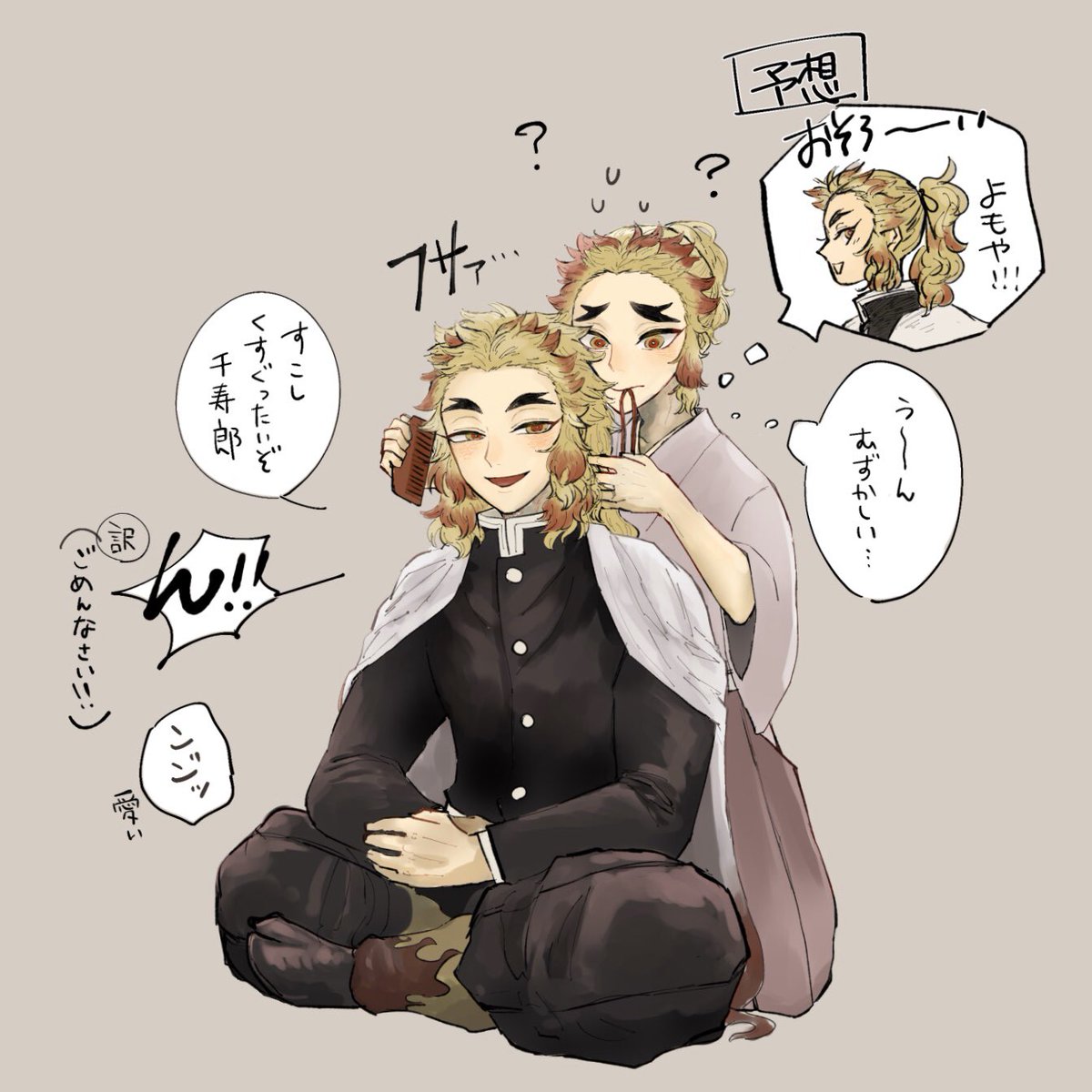 109 534 初めて兄の髪を結う弟 フサフサしてるし自分の髪じゃないから思ったように結べなくてあたふたする弟と、微笑ましく見守る兄 (煉獄兄弟) 19/12/07 00:06
