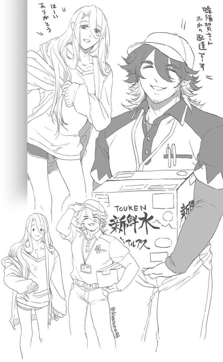 お水の配達をしてくれるそね描きました!はっちはそねの配達に慣れて油断し過ぎのゆるゆる部屋着。そねははっちがあんまりに無防備なのでこんな格好して玄関を開けてはいけないって怒るんだけど危機感ないはっちにわからせるためにグイッと行って欲しい…現パロ長蜂