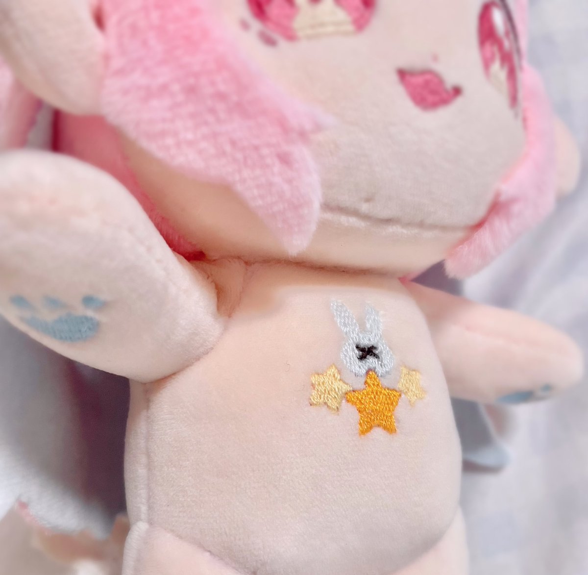 完成しました!友人の子、ななせちゃんです!🐰🩷 いたずらっぽい表情がとびきり可愛く刺せました〜!配信でお見せした胸の刺繍もばっちり仕上がってます🌟 後付けのハーフツインとアホ毛も上手くいったので、今後のぬい作りにも活かせそうです👌 #自作ぬい