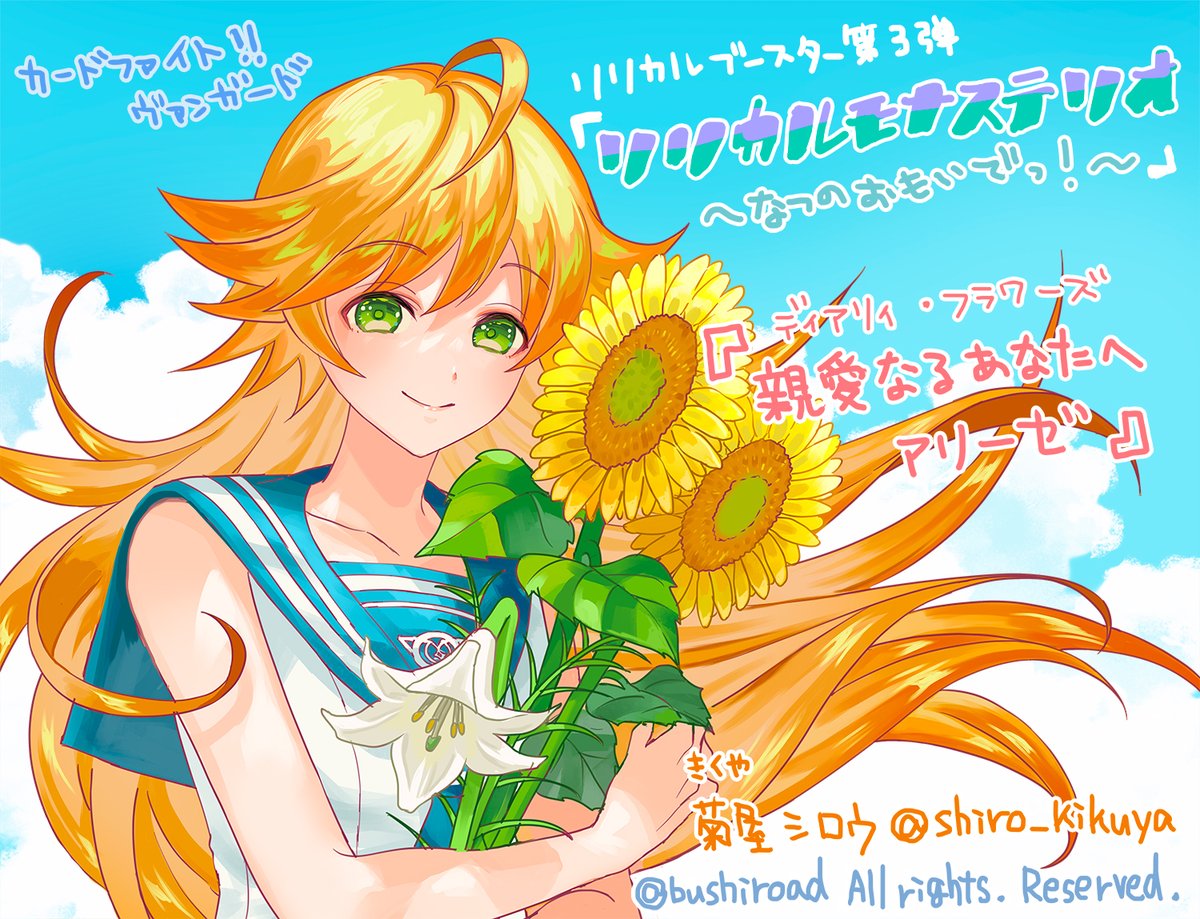本日発売の、カードファイト!! ヴァンガード リリカルブースター第3弾 『リリカルモナステリオ ~なつのおもいでっ!~』にて、「親愛なるあなたへ アリーゼ」を描かせていただきました🌻🌻🌻メディエールと一緒に使ってあげてください!よろしくお願いします〜! #cf_vanguard