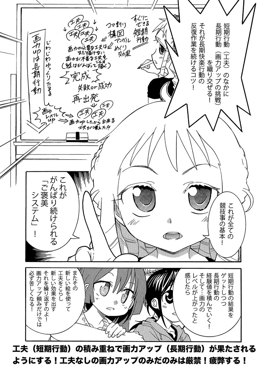 いくら描いても絵が上手くならない人へ(3/4) 大切なことは 画力アップ(時間がかかる事)は考えず 工夫(思いつけばすぐできる事)に集中する事 ヘタな絵でもその中に工夫(意図・仕掛け・ネタとも言い換えられる)があれば読んでもらえる! そして気づけば上手くなっている