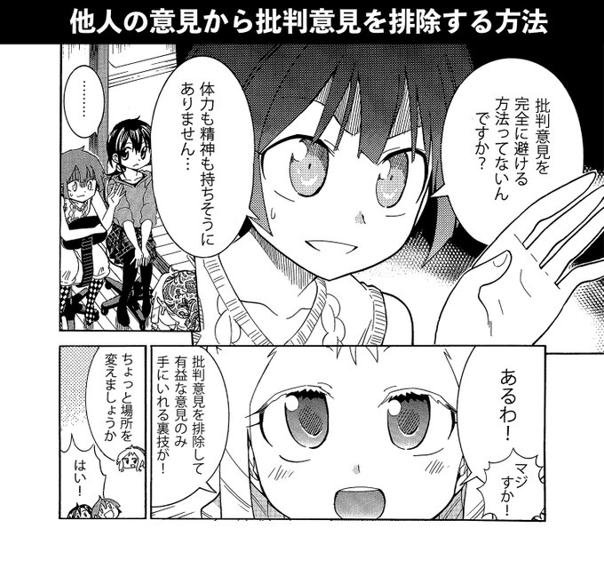 【他人の意見から批判意見を排除する裏技】(1/2) 創作活動などでは他人の批評を聞くと成長が速くなりますが、厳しい批判意見も聞かねばなりません。 その意見をかなり排除できる裏技があります。 是非試してみてください