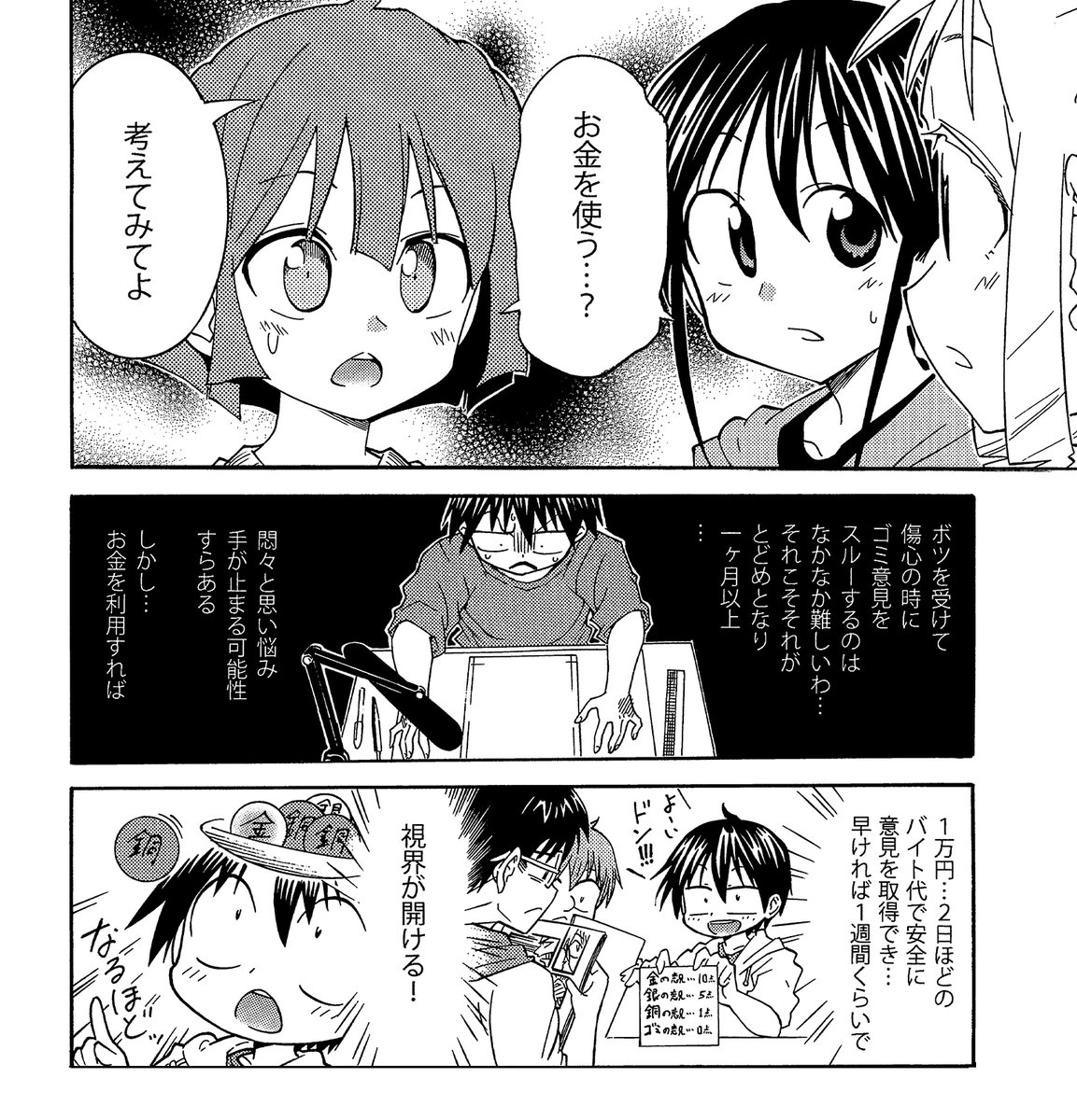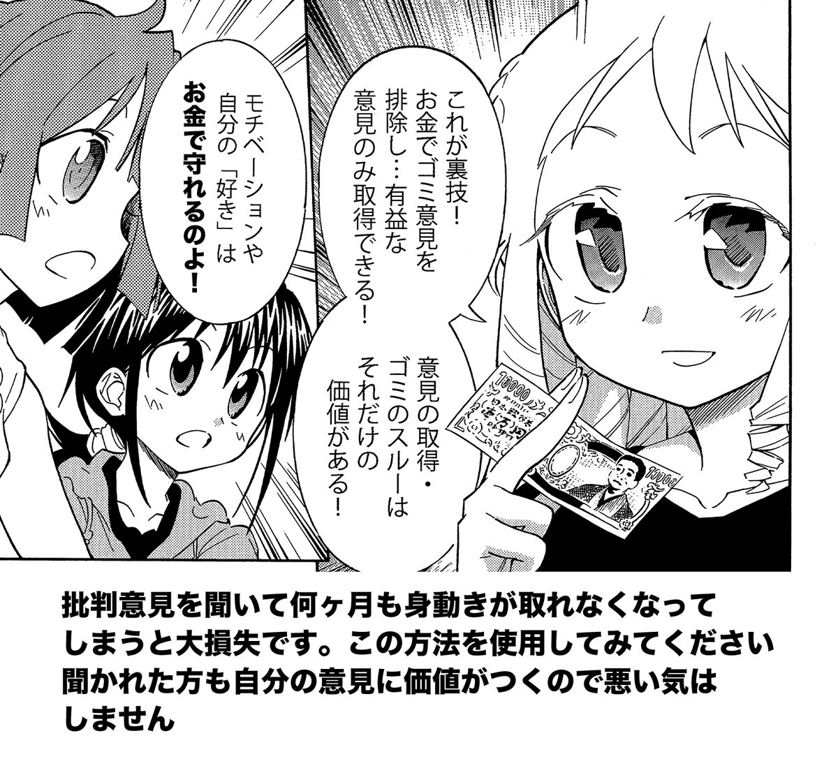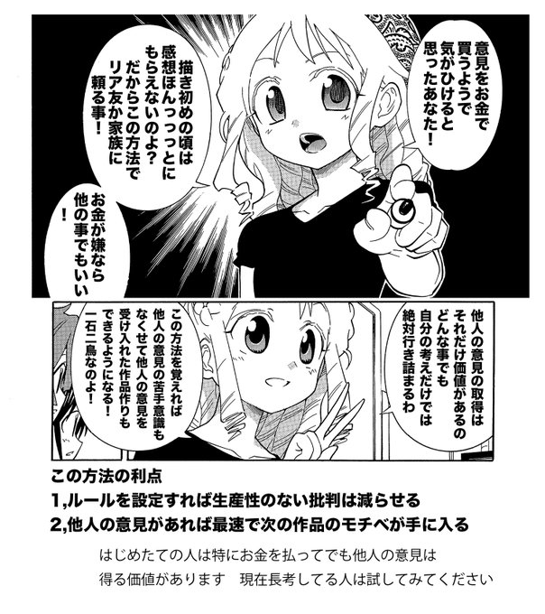 【他人の意見から批判意見を排除する裏技】(2/2) 描き始めの頃はプロとは逆で「お金を払って読んでもらう」と言う意識が大事です 良い意見はそれでけ貴重で長考脱出のきっかけにできることもあります