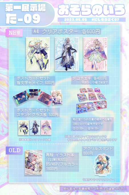 #にじそうさく07 【た - 09】おそらのいろ お品書きです〜❕ 今回は新刊ナシですがその代わりにカワイイグッズ沢山用意しました🎉 デコチェキのデザインや詳細はツリーに繋げますのでそちらでご確認ください💎