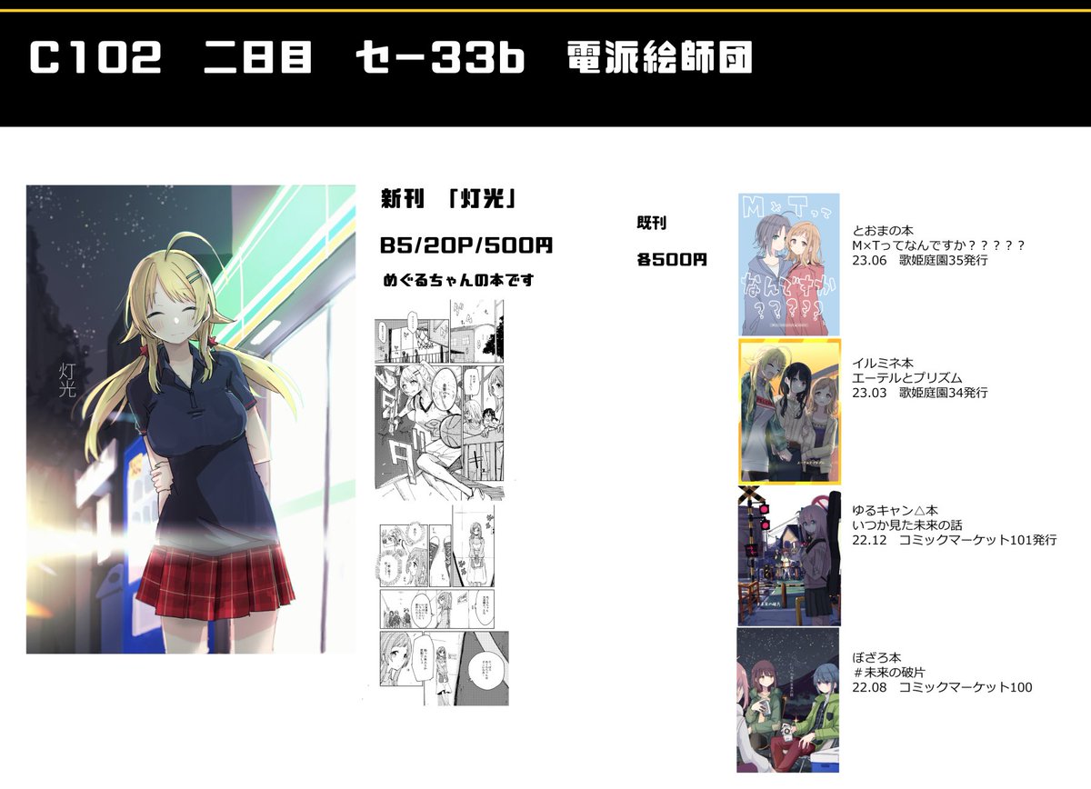 255 895 8/13 #C102 二日目東セ-33b 電派絵師団 新刊『灯光』B5/20P/500(予定) 委託→melonbooks.co.jp/detail/detail.… めぐるちゃんの本になりました よろしくね #C102新刊 #シャニマス 23/08/07 19:19