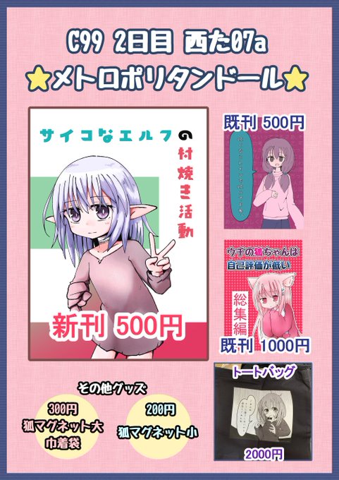 C99 2日目西た07a メトロポリタンドール 新刊『サイコなエルフの村焼き活動』 欠損系エルフちゃんと一般おにーさんのほのぼのハートフル4コマ本だよ!よろしくね 委託 melonbooks.co.jp/detail/detail.… pixiv pixiv.net/artworks/95099…