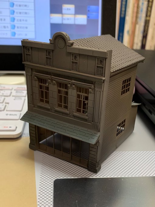 昼休み工作、なんとなく色を載せてみました😊 #ペーパークラフト #看板建築 #ジオラマ #鉄道模型