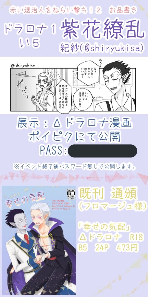 #0319ドロ情報 東1 イ14b紫花繚乱の頒布物一覧です。 【新刊】 支部サンプル→ pixiv.net/artworks/10627… 通頒🛁→ melonbooks.co.jp/fromagee/detai… お取り置き(相互フォローの方)→ triokini.com/circle/item/li… Δドラロナ結|婚アンソロのフライヤーをお預かりしております!詳細はリプツリーに繋げます。