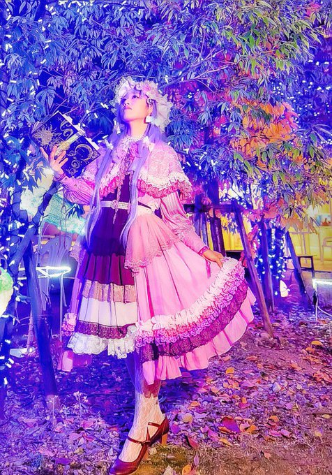 初音ミク 千本桜 楽曲をイメージして生地は全て桜柄で製作しました。 小道具は桜の花びら3500枚を1枚ずつ繋げて作りました。 #和装キャラは世界を魅了する twitter.com/curecos/status…