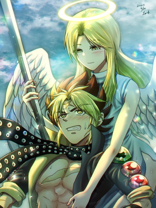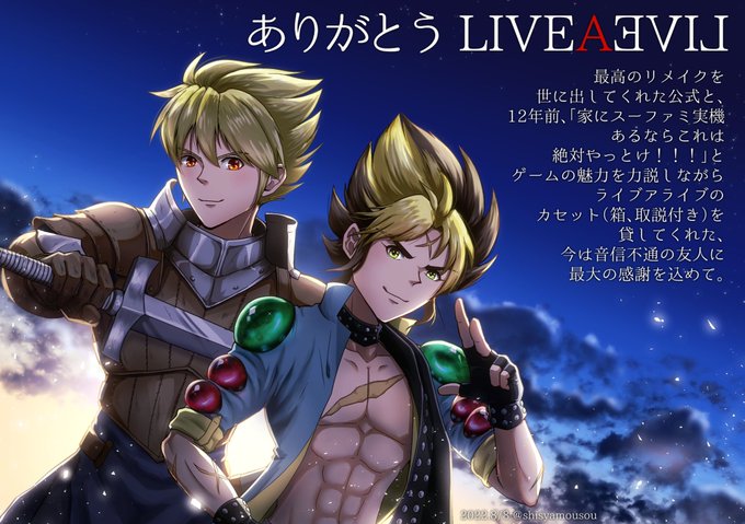 真エンド初回クリア記念の感謝絵。(クリアしたの数日前だけど) 最終編の主人公に選んだアキラと、発売記念絵でちゃんと描いてあげられなかったオルステッドで。 #ライブアライブ #LIVEALIVE