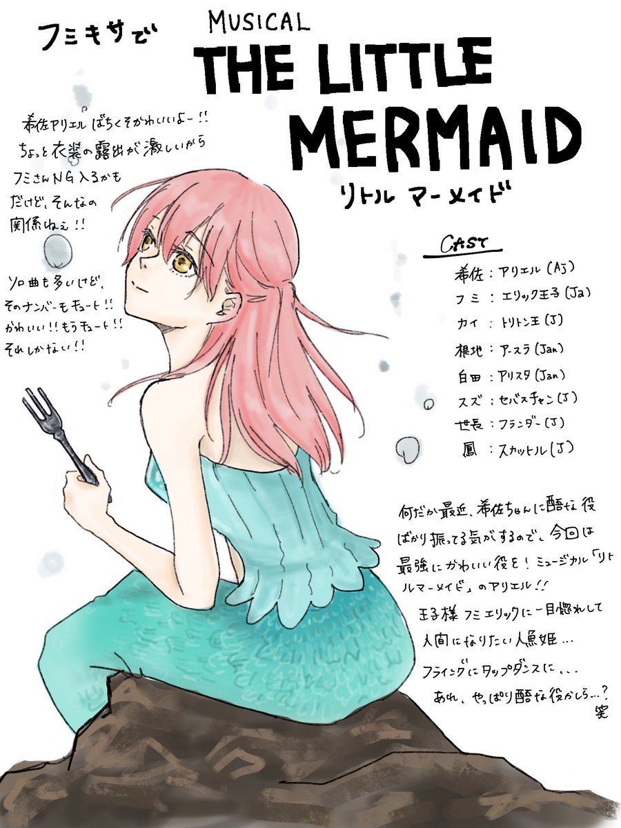 JJミュージカル企画〜 フミキサで「リトル/マーメイド」🐋 人魚姫の希佐ちゃんと人間の王子様のフミさんの一目惚れ&一聴惚れのラブロマンス〜❤️ 希佐ちゃんに幸せになって欲しくて… でもよく考えたらフライングとか タップダンスとか歌唱とか大変… #ユニヴェール美術部