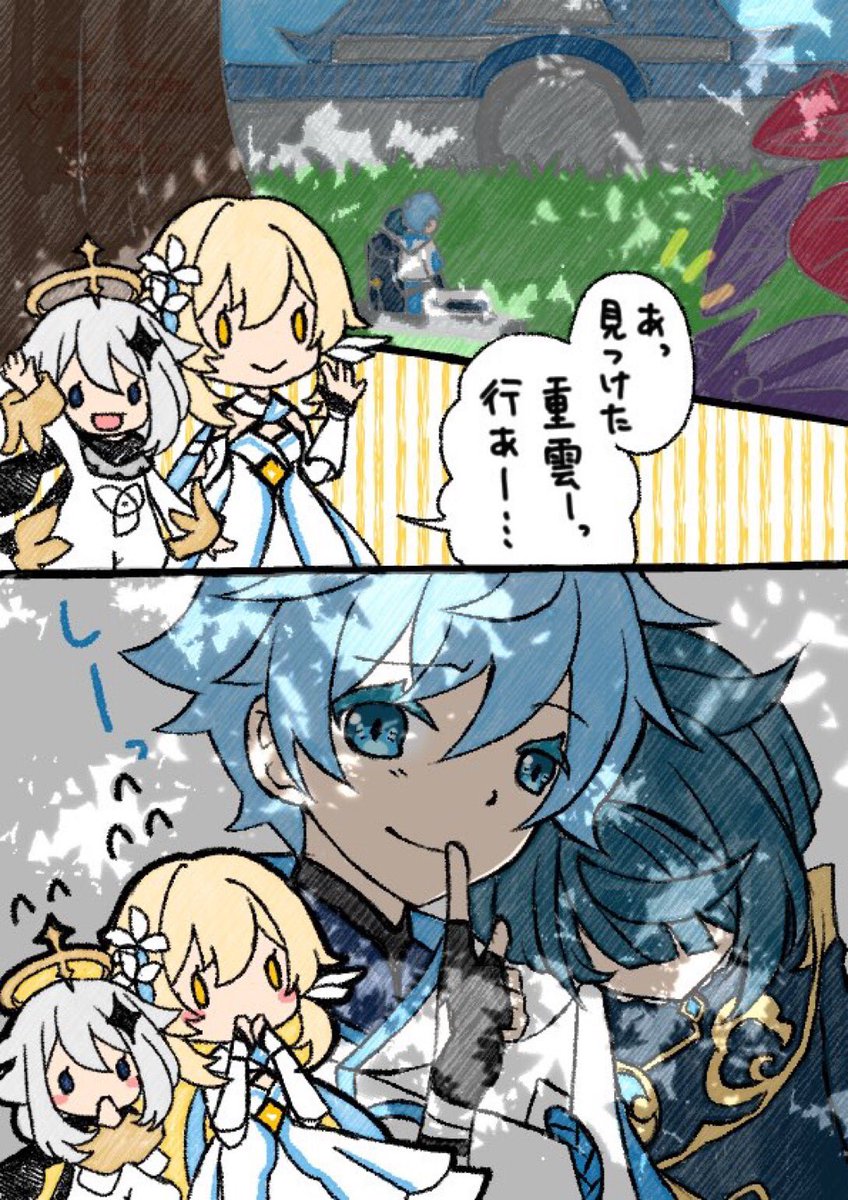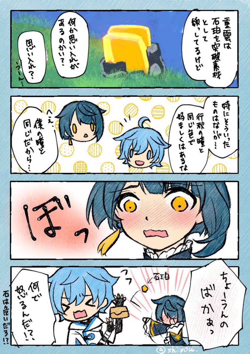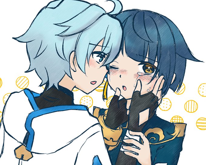 5 18 「泣き顔」 #重行ワンドロワンライ 📘「重雲、ちょううん⋯はやく⋯」 🍨「動かないでくれ、目に入ったゴミが取れない」 23/01/15 23:00