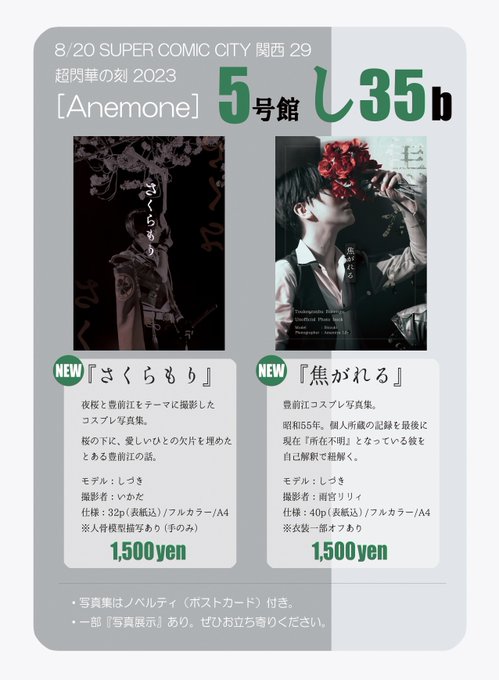 【8/20インテ参加のご案内🙌】 サークル名『Anemone』 ⑤号館し35b 豊前江🏍️写真集2冊 頒布🆕 ▫️焦がれる A4 / 40p ▫️さくらもりA4 / 32p 各1,500円 豊前のコスプレでお迎えします✨ ぜひお立ち寄りください☺️ #瞳にアネモネ0820