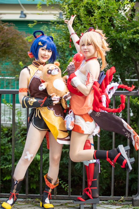 ⚠️Cosplay⚠️ 原神 🌶香菱 ぴよまるさん@piyomaru_cos 🎇宵宮 雫 📸爆睡太郎さん@matomo9326 炎元素共鳴〜🔥🔥🔥🔥 『火ぃつけるでぇ』 #ミヤオリ #GenshinImpact #GenshinImpactcosplay #原神コスプレ