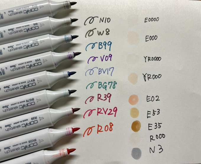コピック画材追加しました☀️ ①色の出が悪いコピックを新しくしました。(右側) ②濃い色のコピックを、スケッチファインという細いペンに変えました。細かいところが塗りにくいという声もあったので、これを使えば塗りやすいと思います! #コピックイラスト #静岡 #イラスト