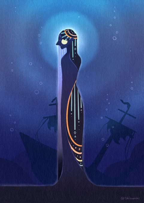 #人外版深夜の真剣お絵描き60分一本勝負 「アナタが考える深海に潜んでいそうな人外」で参加させていただきました! 沈没船の近くに度々現れる美しい未確認生物、耳をすますと静かに歌っているのが聞こえるが、未知の言語で内容は理解できない