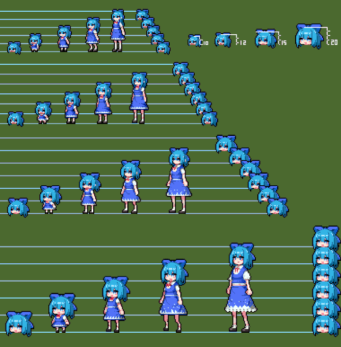 57 236 不同尺寸和头身比的琪露诺 #pixelart #チルノ #ドット絵 23/03/07 23:48
