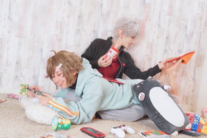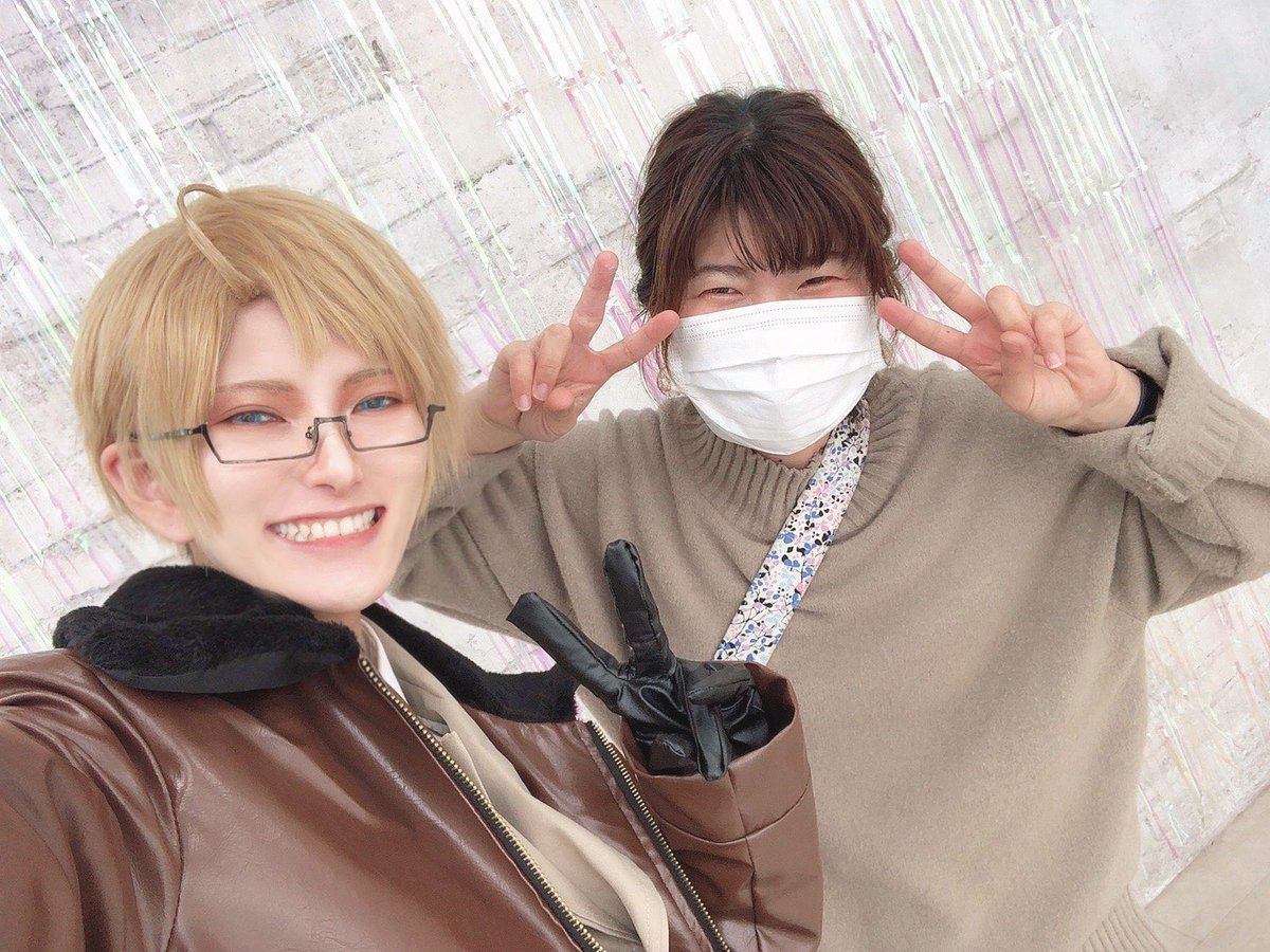 6 32 日曜は衣と一緒にハコスタジアム大阪さんに行きました! ほねさんから頂いた速報上げちゃお📸 1枚目はスリッパ履かせるのに一生親指入らんくて笑ってるのとほねさんがわァ光っちゃったって言ってたのとライティング講座中のバカ笑いの3本! 🎲昌 🔫衣 photo by ほねさん 🌈🕒コスプレ注意 #ハコアム大阪 21/12/13 21:05
