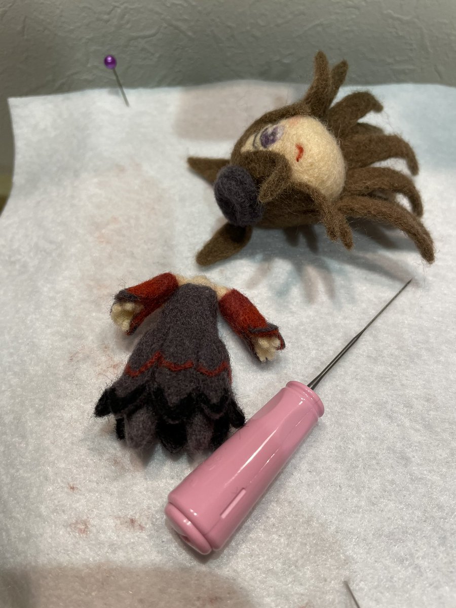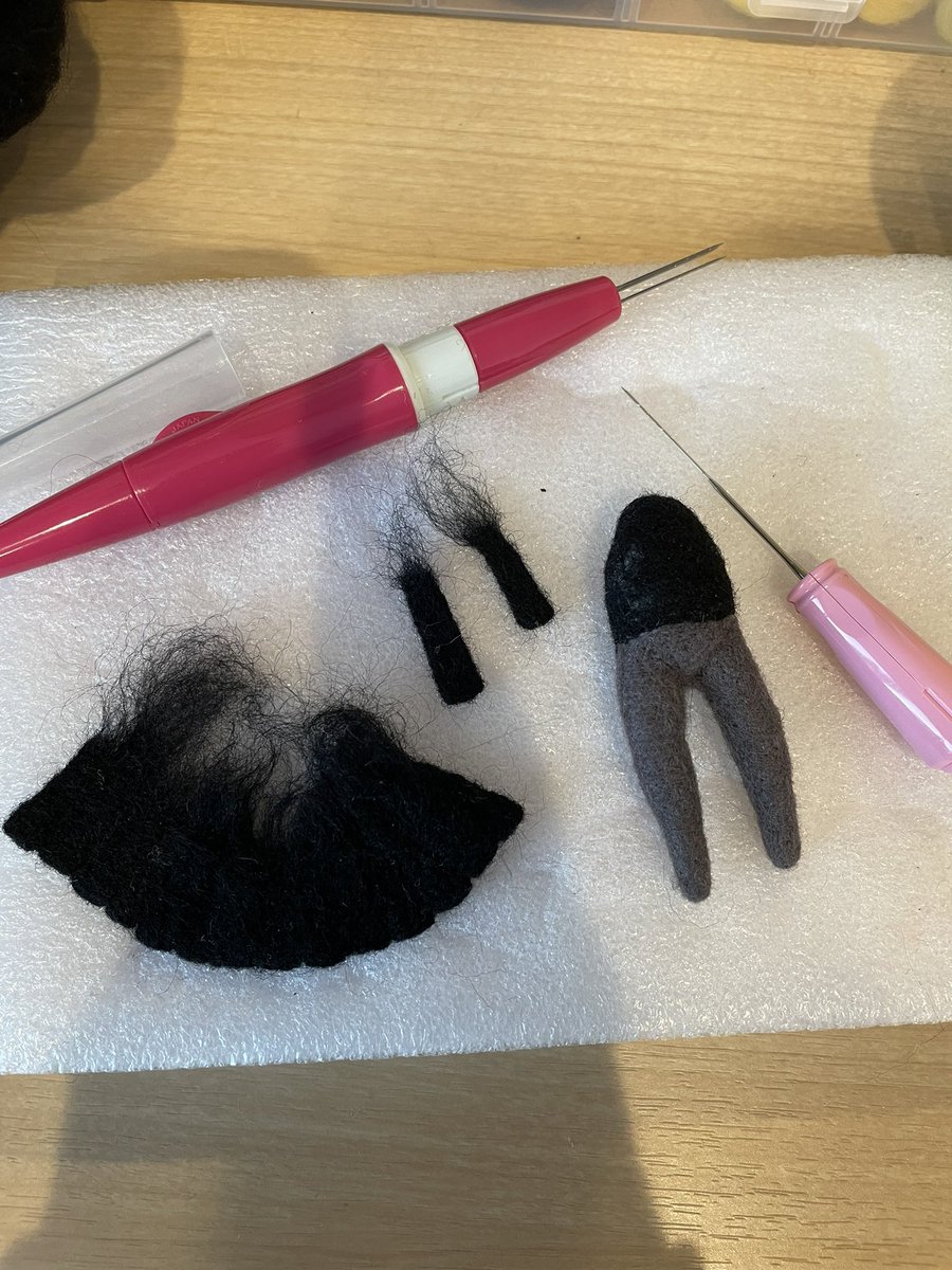 しまったぁぁぁぁ! 勢いで作ったけど、衣服の色の羊毛がねぇ! 黒よりのグレーを買わないと進まん!! #羊毛フェルト #羊毛フィギュア