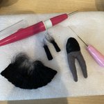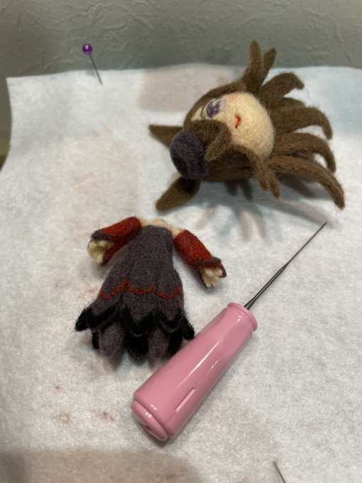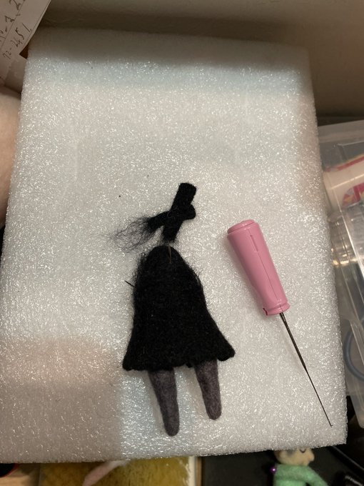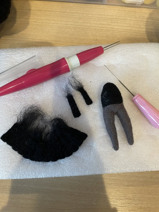 1 11 しまったぁぁぁぁ! 勢いで作ったけど、衣服の色の羊毛がねぇ! 黒よりのグレーを買わないと進まん!! #羊毛フェルト #羊毛フィギュア 22/07/18 15:56