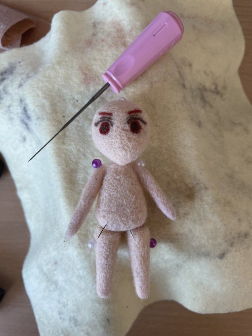 肌色のせつつ、目を入れてみた! 左の肘が痛ぇぜ! #羊毛フェルト #羊毛フィギュア