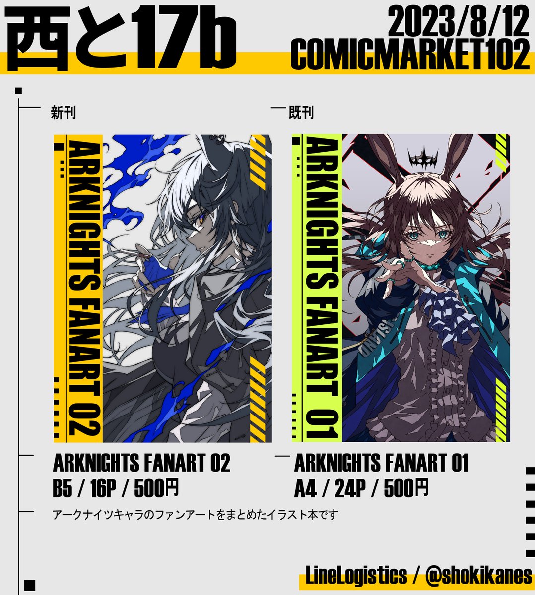 C102お品書きです! 段ボールあさってたら数冊ですけど既刊の「ARKNIGHTS FANART 01」がでてきたのでこちらも合わせてよろしくお願いします! #C102 #C102お品書き