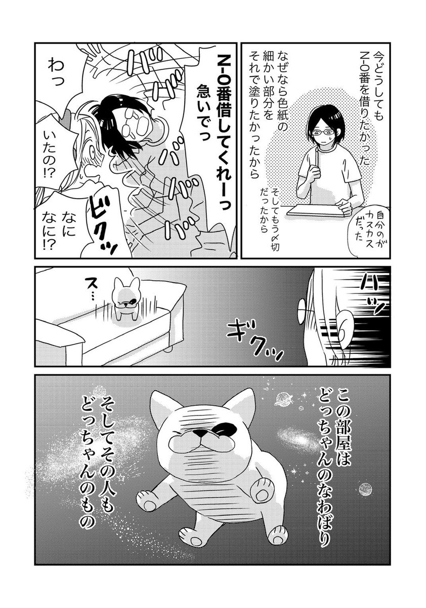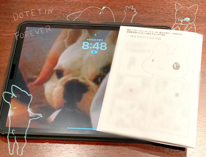 どてちん小冊子、藤生の描いた話に泣いた。どてちんがいた事で私と藤生の人生は確実に変わったと思う。どてちんと家族になれてとても幸せだったから亡くなってしまった時は本当に悲しかった。その未だに生傷である感情を描ききった藤生の筆力が素晴らしくて恐ろしい。私のページなんだあれは笑