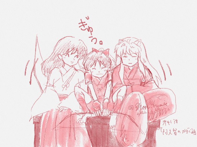 犬夜叉一家団欒の図。日暮家からもらったどてらと共に。。 きっと家着でずっと着てるんだ。。 かわいすぎもろ子。。はすはすはすはす。 朔の日はきっと皆かたまって過ごすのじゃ。安心〜。 幸せな明日に。 #犬夜叉 #半妖の夜叉姫 #かごめ #もろは #funart