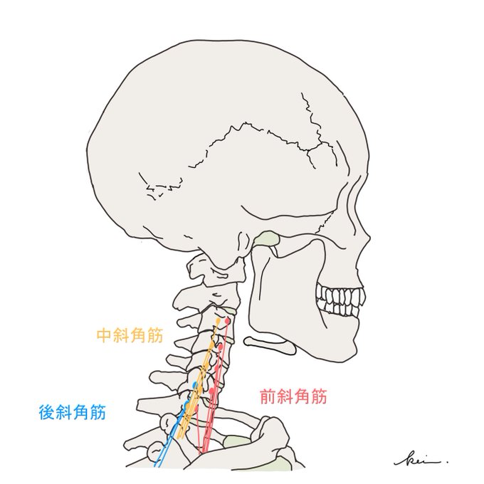 【斜角筋群】 ✍️前斜角筋と中斜角筋と 第1肋骨のあいだのスキマ→斜角間隙 ✍️斜角間隙には腕神経叢がとおる ✍️努力性呼吸や姿勢がわるくなると、筋によって神経が絞扼される ↓ ↓ 胸郭出口症候群 (斜角筋症候群) #アナトミーイラスト (たまには解剖イラストも載せようキャンペーン)