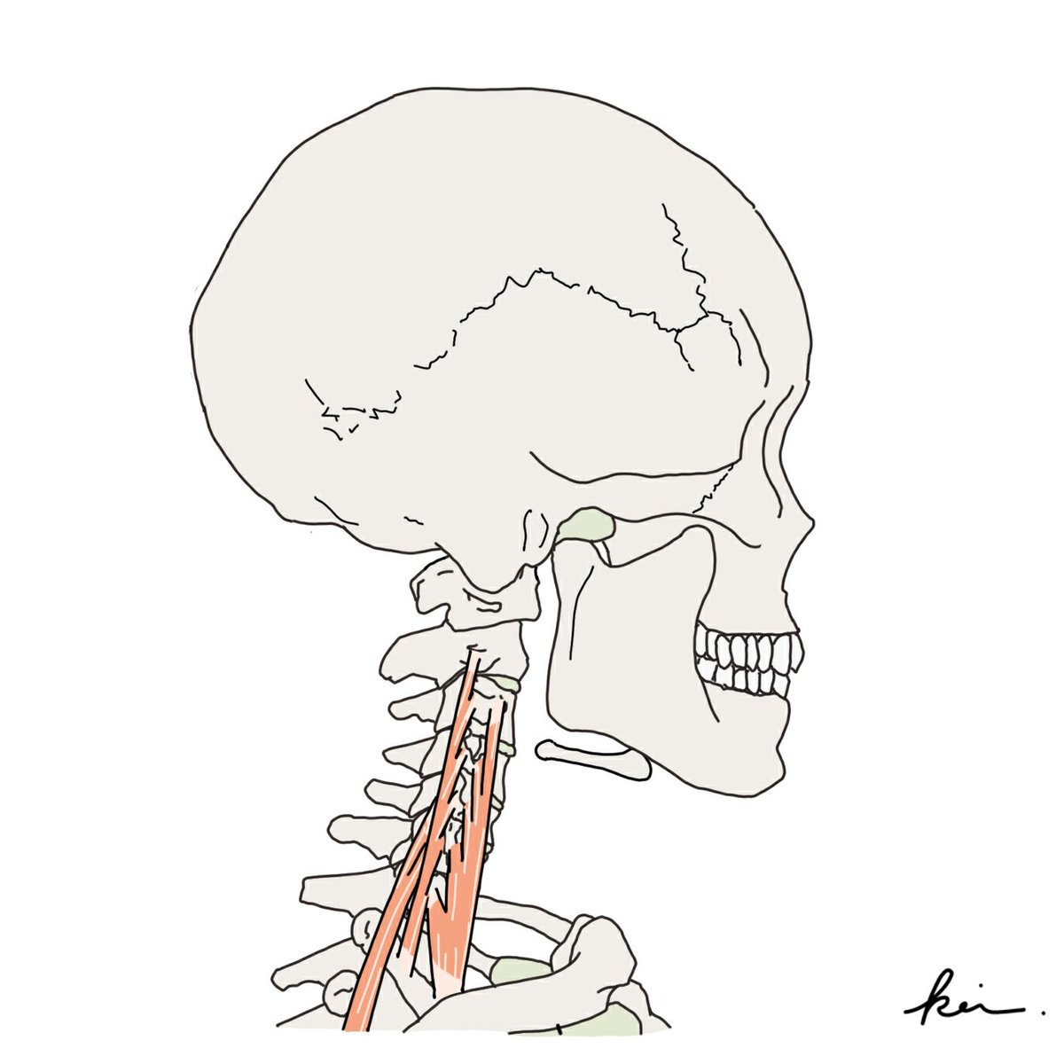 【後頭下筋群】 ・大後頭直筋 ・小後頭直筋 ・上頭斜筋 ・下頭斜筋 この4つの筋は起始が環椎や軸椎、停止の多くが後頭骨に付着しているので、頭部の伸展に関与します #アナトミーイラスト twitter.com/resol_koki/sta…