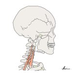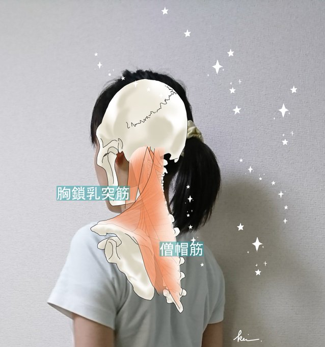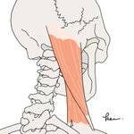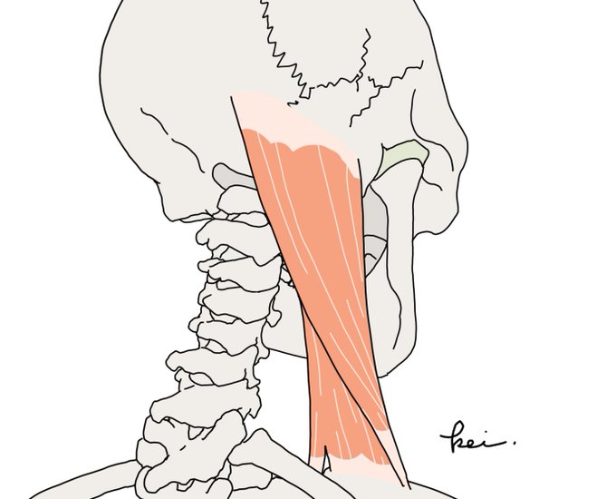 ストレッチは筋の走行をイメージして 【ストレッチ法】 ✍️僧帽筋(上部) →斜め前に頸部側屈 (伸ばす方の腕を腰の後ろに) ✍️頭板状筋 →斜め前に頸部屈曲 ✍️肩甲挙筋 →回旋+側屈 #アナトミーイラスト