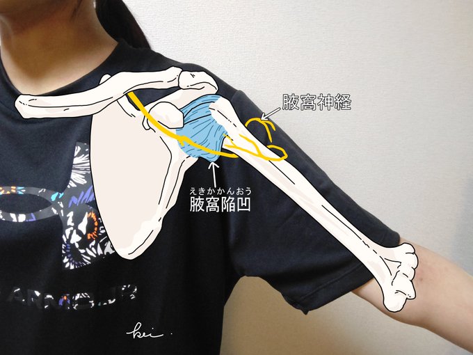 【腋窩陥凹&腋窩神経】 ぱっとこの2つの組織の位置関係がわからなかった人のために… 腋窩陥凹と腋窩神経をイラストにしてみました! 《腋窩神経》 支配筋︰小円筋と三角筋 腕神経叢の後神経束から分かれている #アナトミーイラスト twitter.com/PtGekikara/sta…