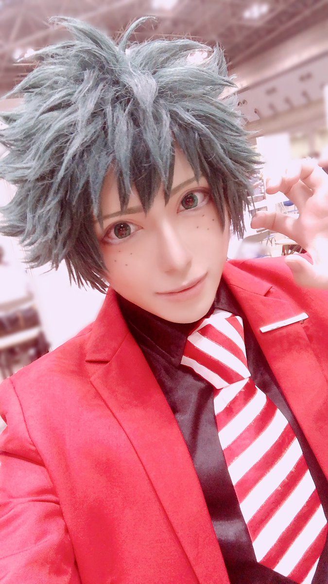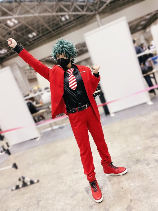 【Cosplay】MHA 緑谷出久 ちかやさんのスペースに売り子でお邪魔して8周年描き下ろしスーツのデクくんやってきたよ 赤スーツすぎて完全にカズレーザーだったわ^ ^ ネクタイ長すぎた😇 ろきくんとの2ショは後程🍰🥦