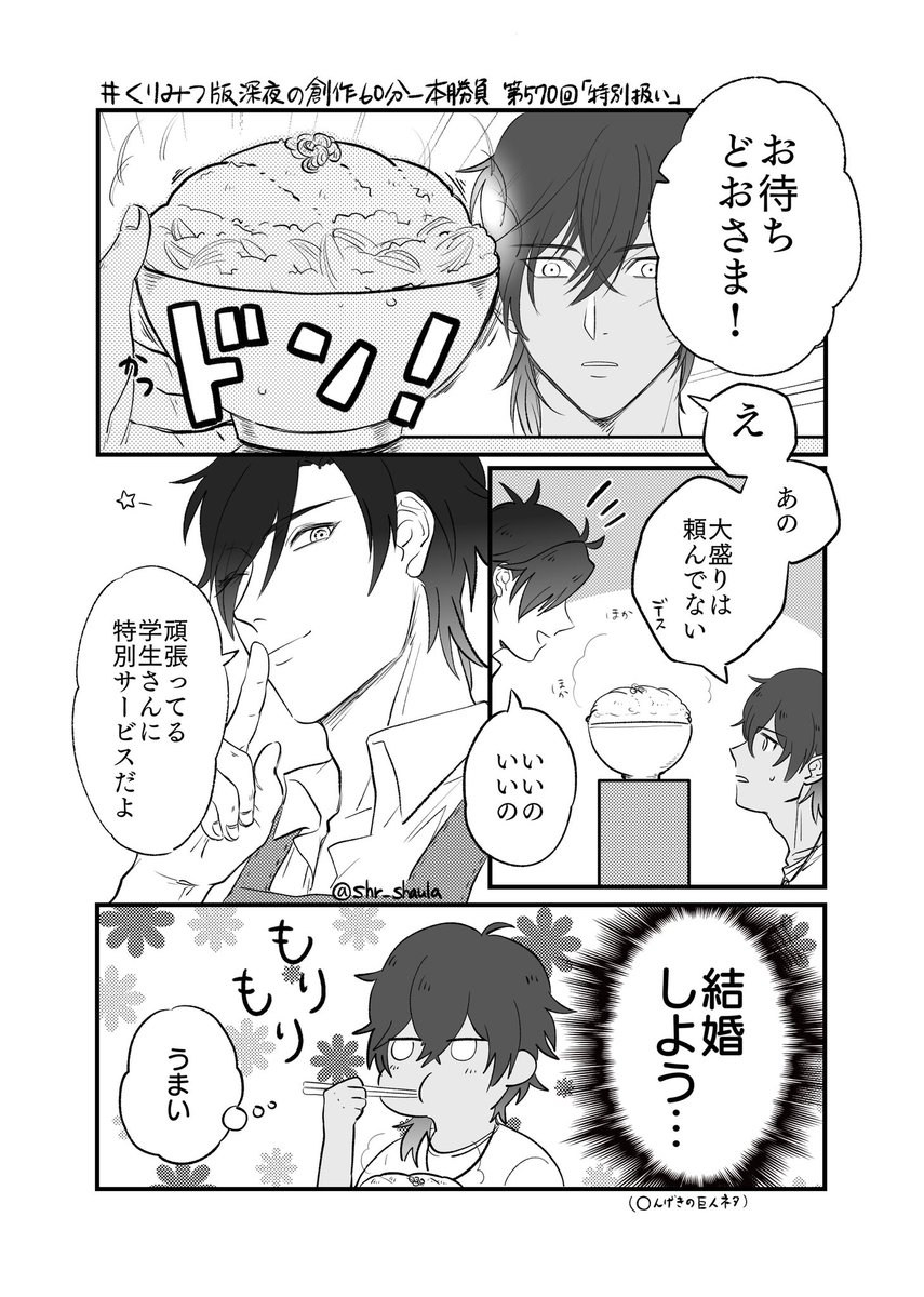 @kurimitsu_60m02 ※現パロ(学生×料理人) 前倒しで30分くらいオーバーしています…すみません🙇🏻💦 第570回「特別扱い」 #くりみつ版深夜の創作60分一本勝負