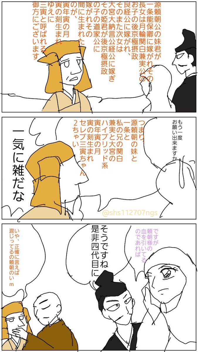 三寅ちゃんが4代目になった理由(安定して色々と雑だけど、2コマ目ちゃんと雑になってないような)(※3コマ目の大江殿は○してるんじゃなくて慈円のお口チャックしてるだけ) #鎌倉殿の13人 #鎌倉絵 #殿絵 #fa