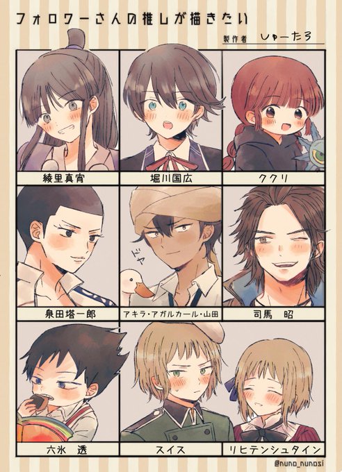 大変お待たせしましたが、描かせていただきました!色んなキャラ描けてとっても楽しかったです!ありがとうございました~! #フォロワーさんの推しが描きたい